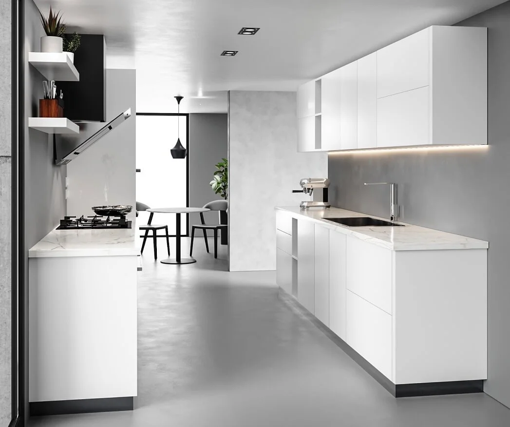 The layout is a great fit for a tight kitchen area, or, to be specific, a small modular kitchen design, because it efficiently optimises the kitchen by dividing it into two different zones.